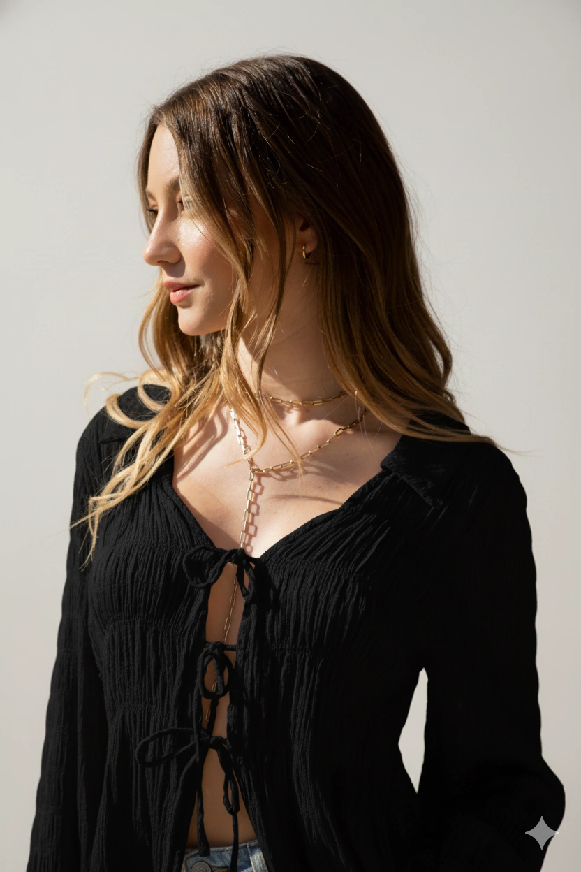 Blusa CASAP de bambula, ligera, fresca y delicada. Con mangas acampanadas y escote en V profundo realzado por delicados lazos ajustables. Perfecta para un look cómodo y sofisticado.
