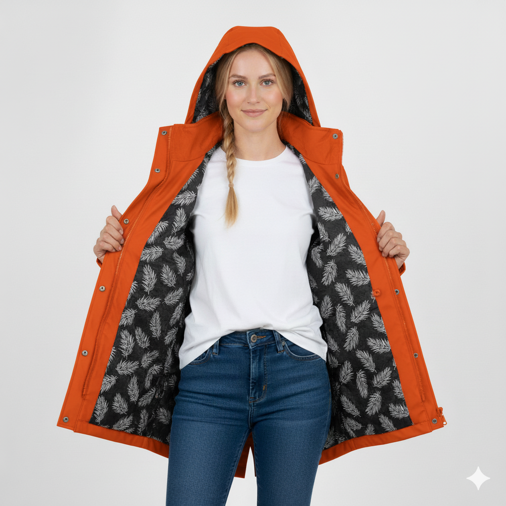 Parka rompevientos de mujer, tiene bolsillos externos y capucha