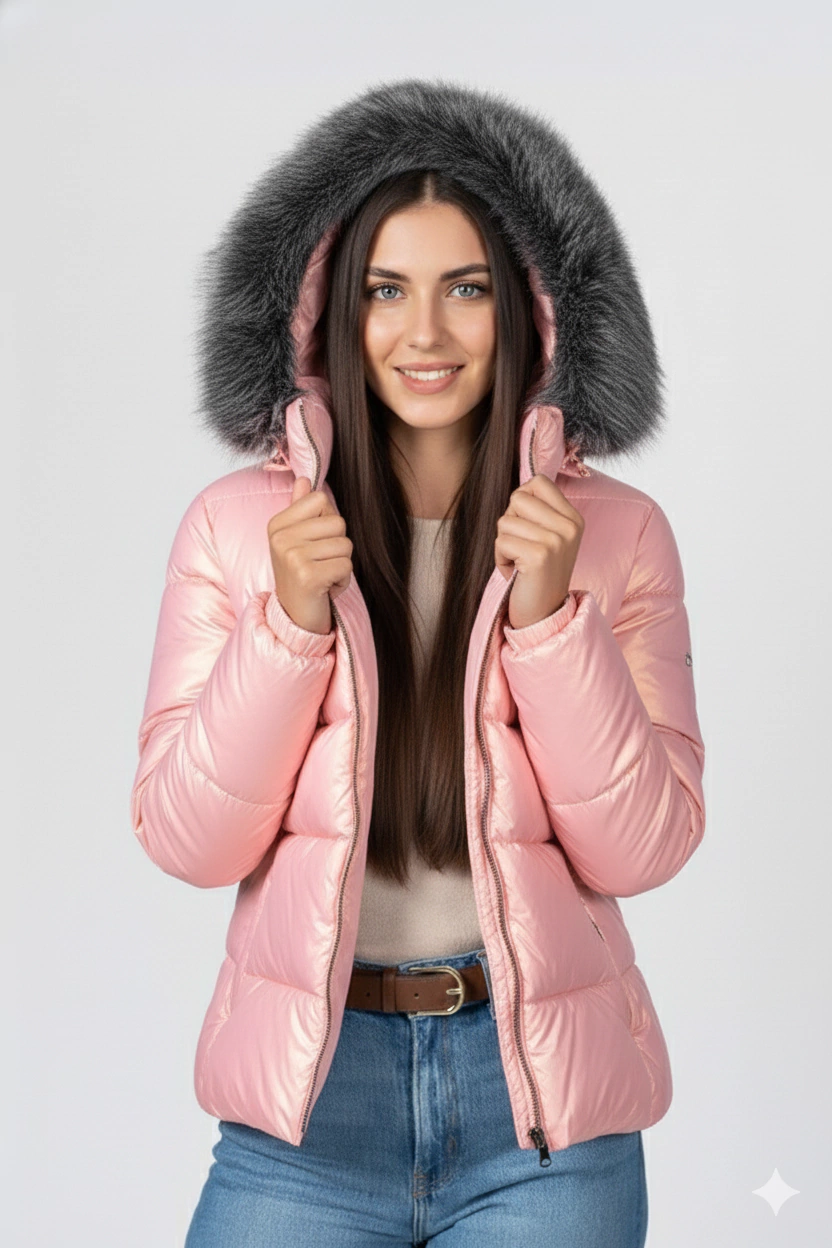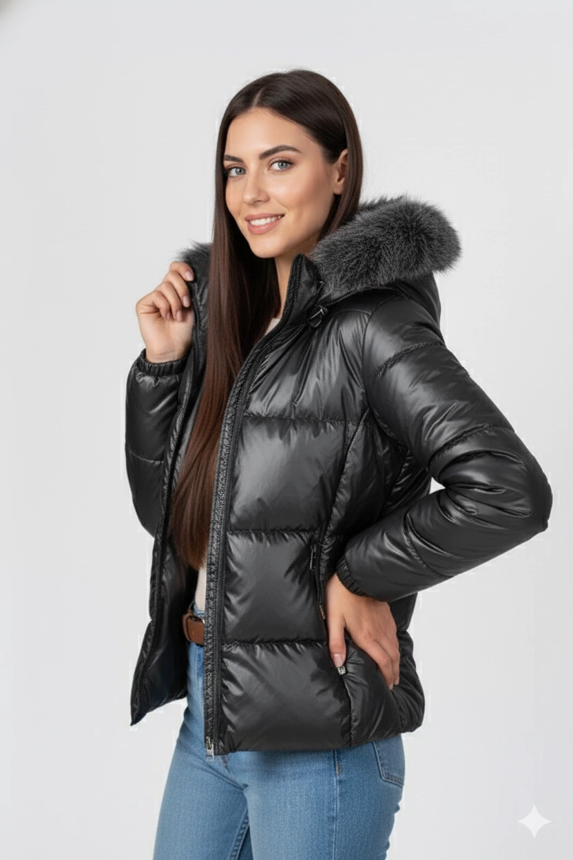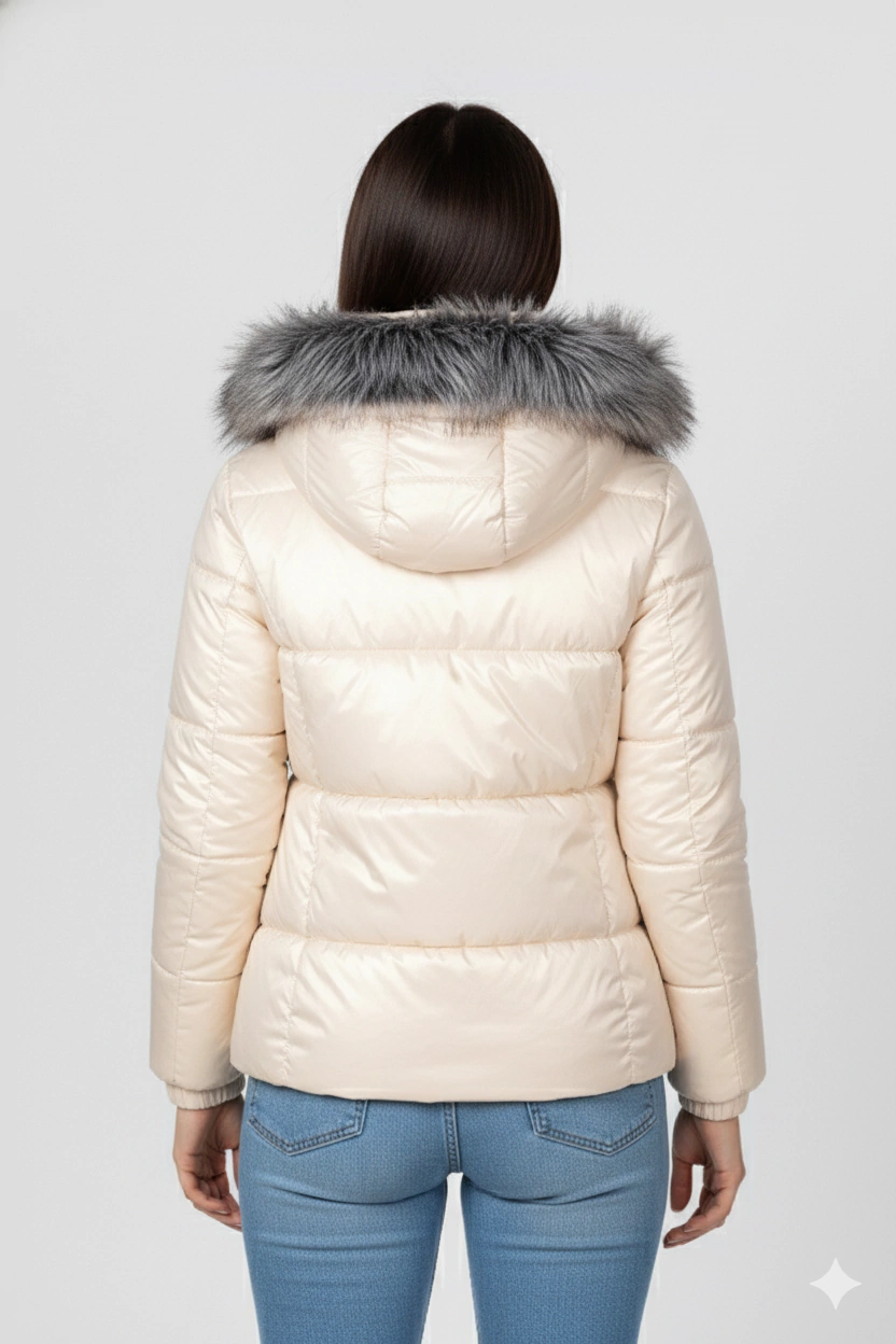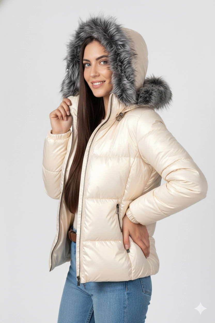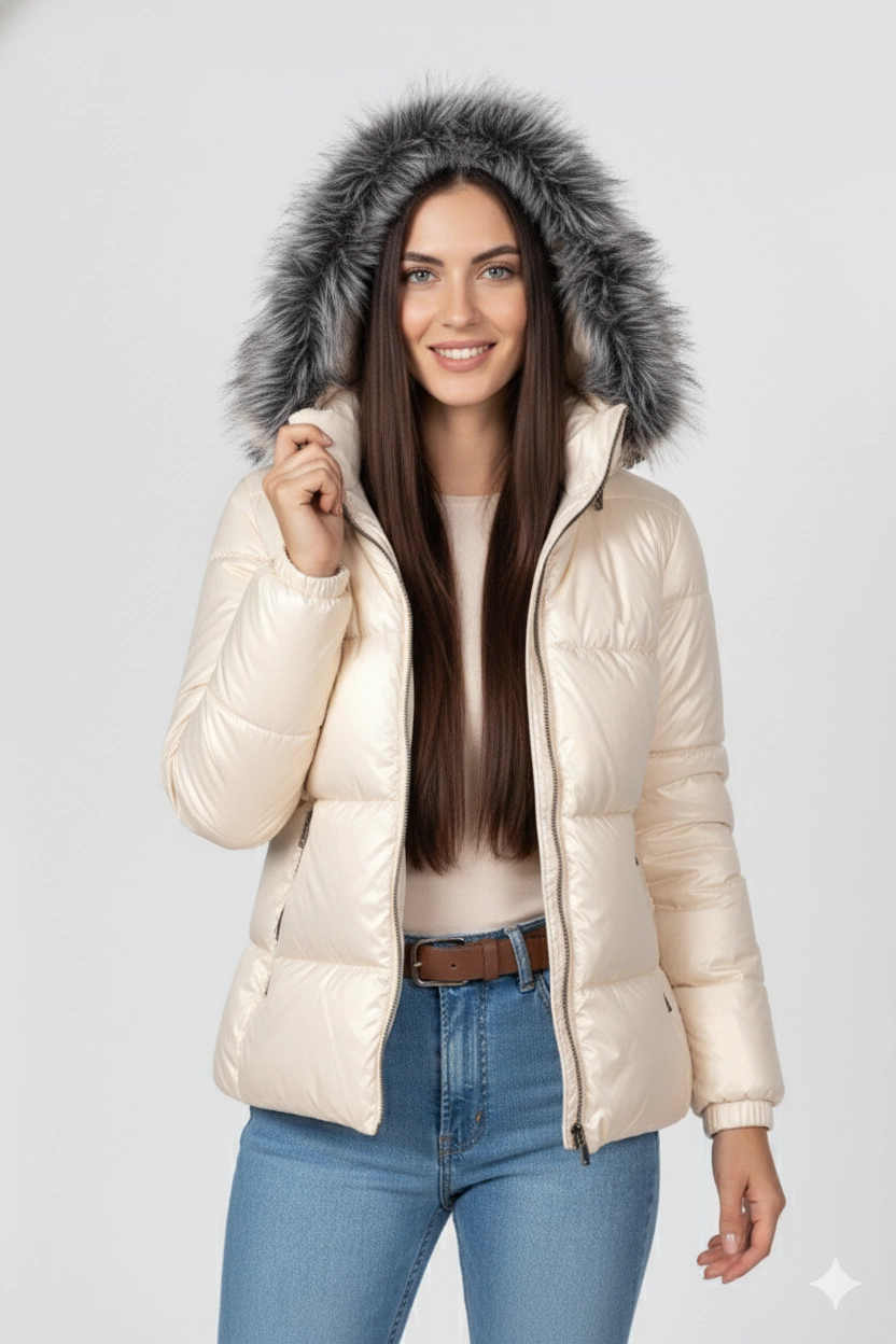 El modelo ETHEL combina estilo y confort con su diseño ultra liviano y material térmico que te mantendrá abrigada. Cuenta con un moderno matelasseado y una capucha con detalle de piel sintética.