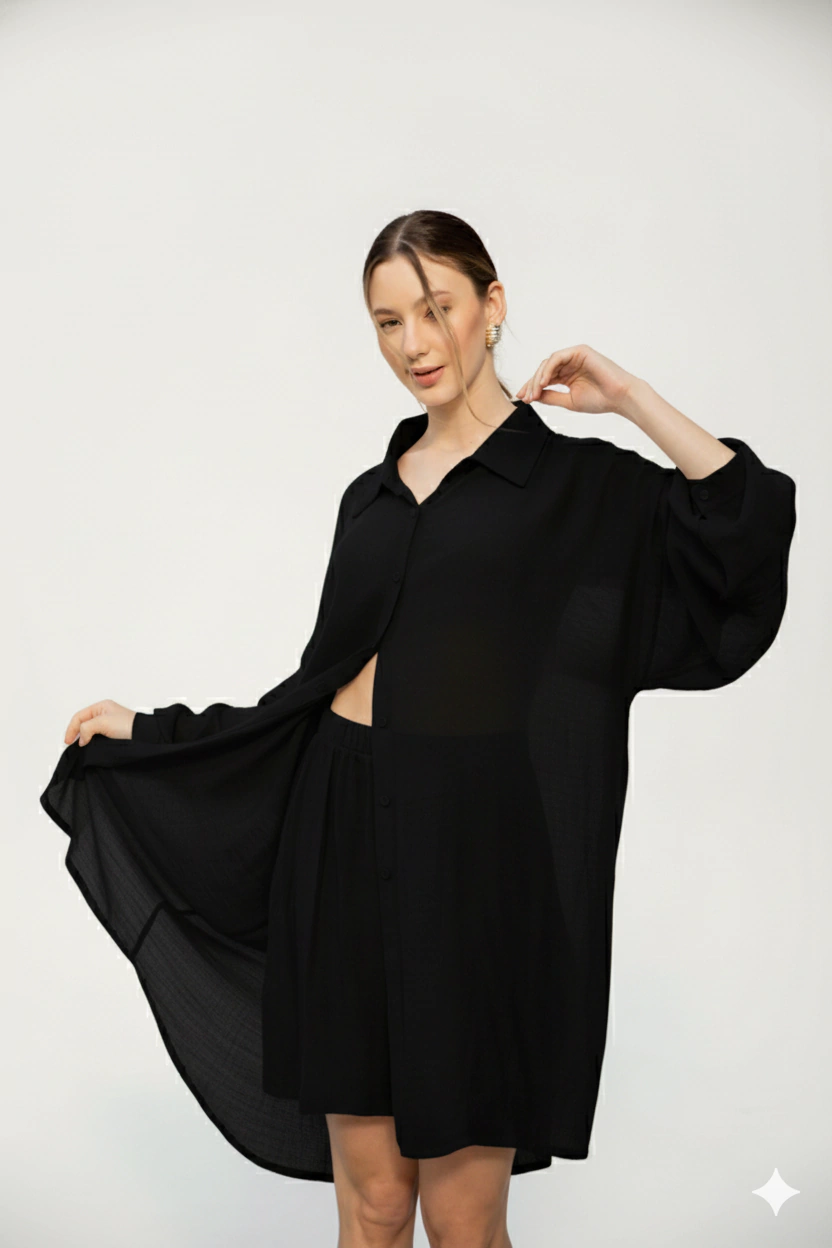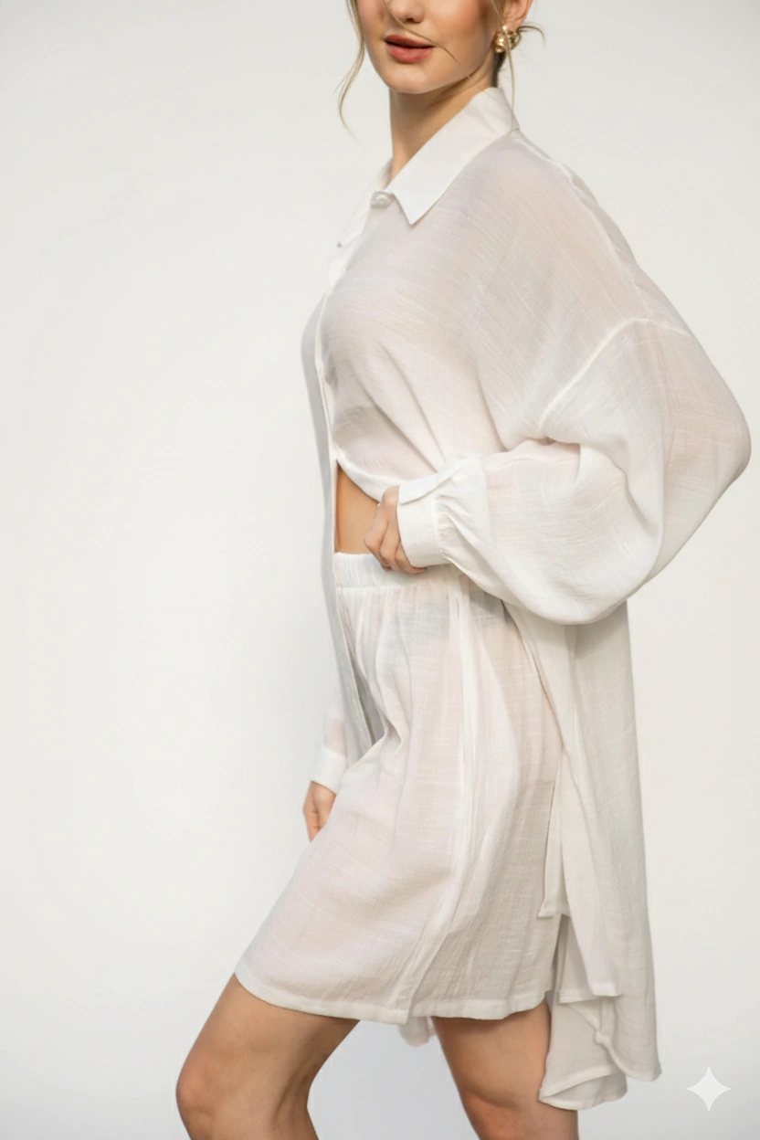 Conjunto confeccionado en lino liviano, compuesto por camisa oversize y short con cintura elástica. La camisa presenta un calce amplio, botones frontales y mangas largas con puño, aportando movimiento y frescura. El short acompaña con un diseño relajado y cómodo. Ideal para looks de verano versátiles, tanto para la ciudad como para la playa.