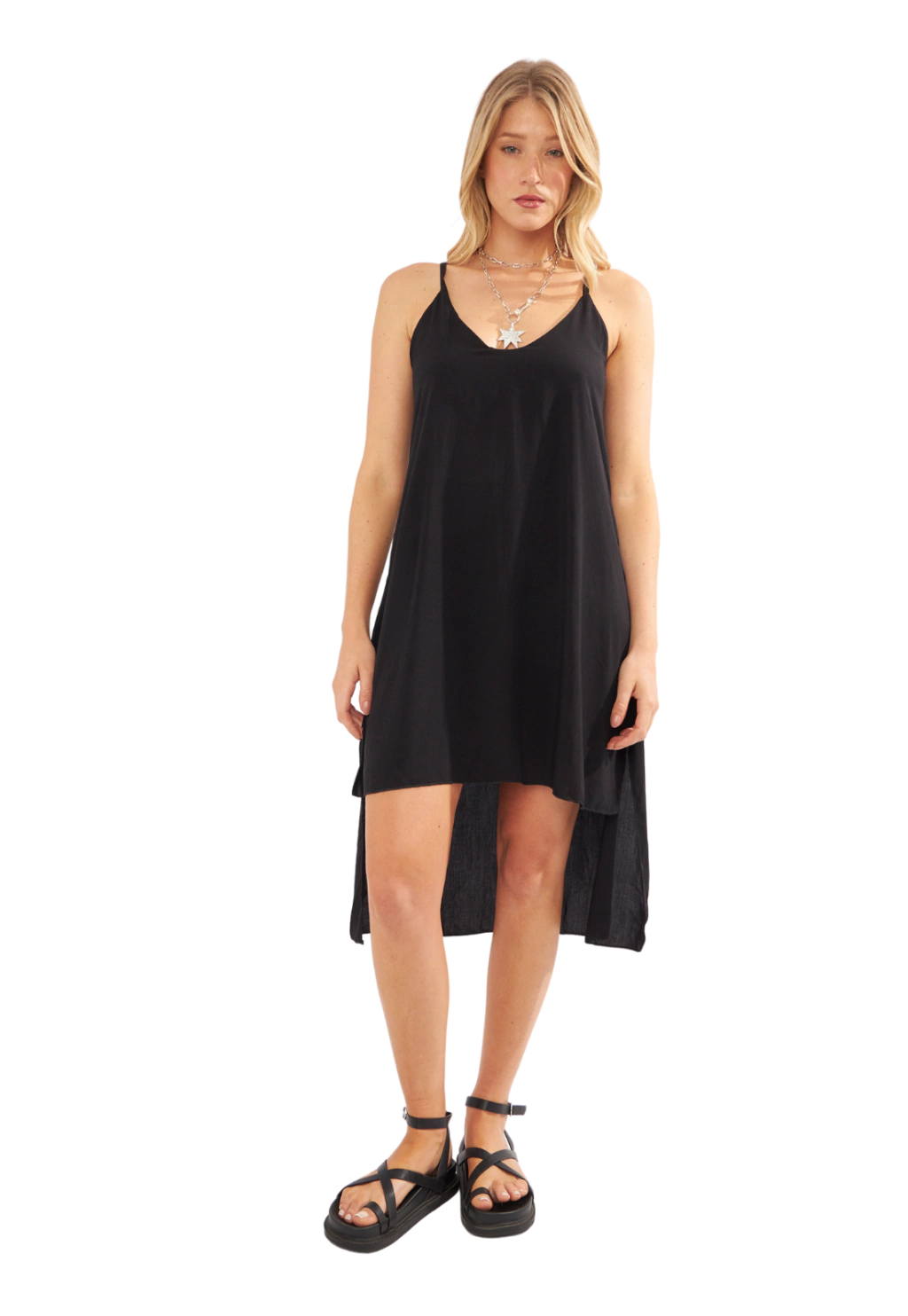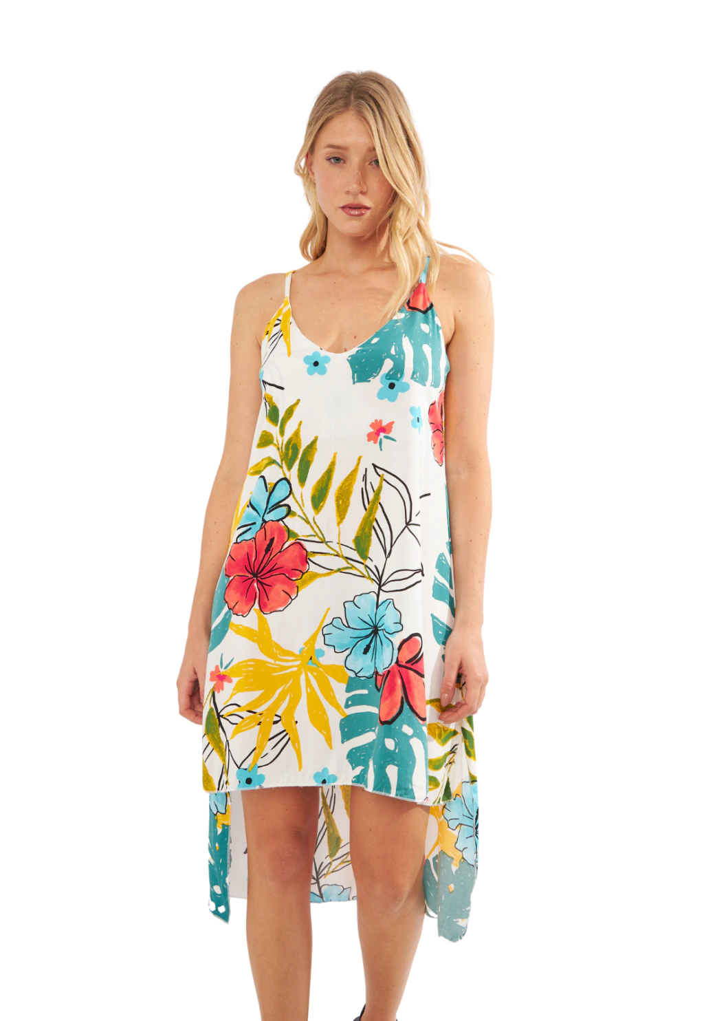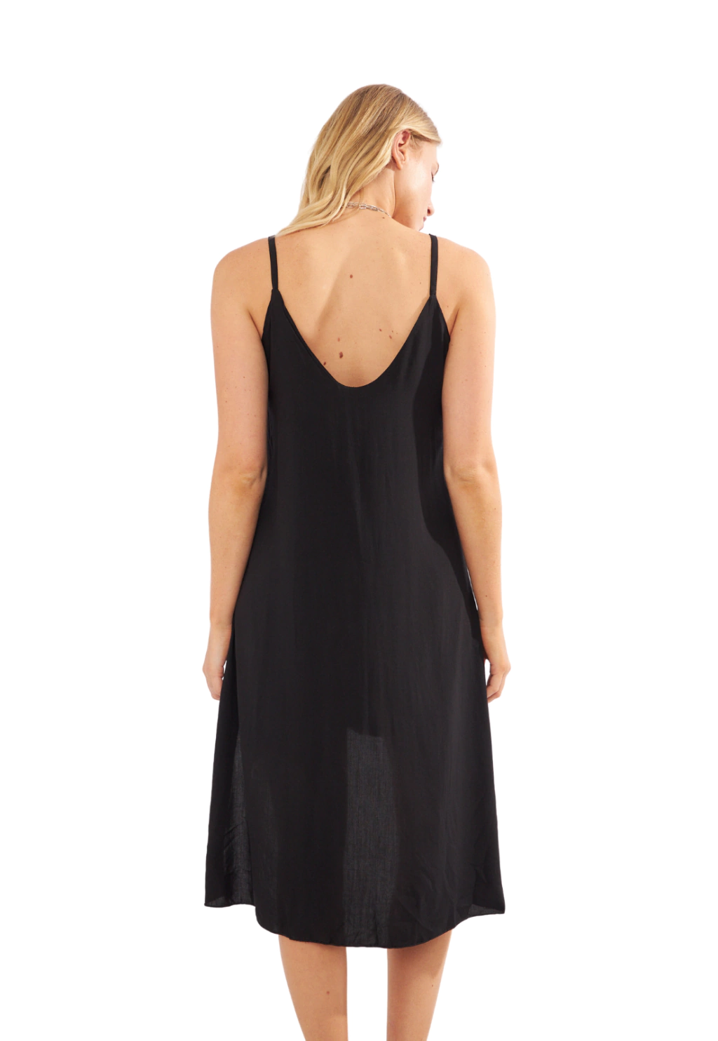 Este vestido ligero y fresco está disponible en varios estampados vibrantes y en clásico negro. Tiene breteles finos