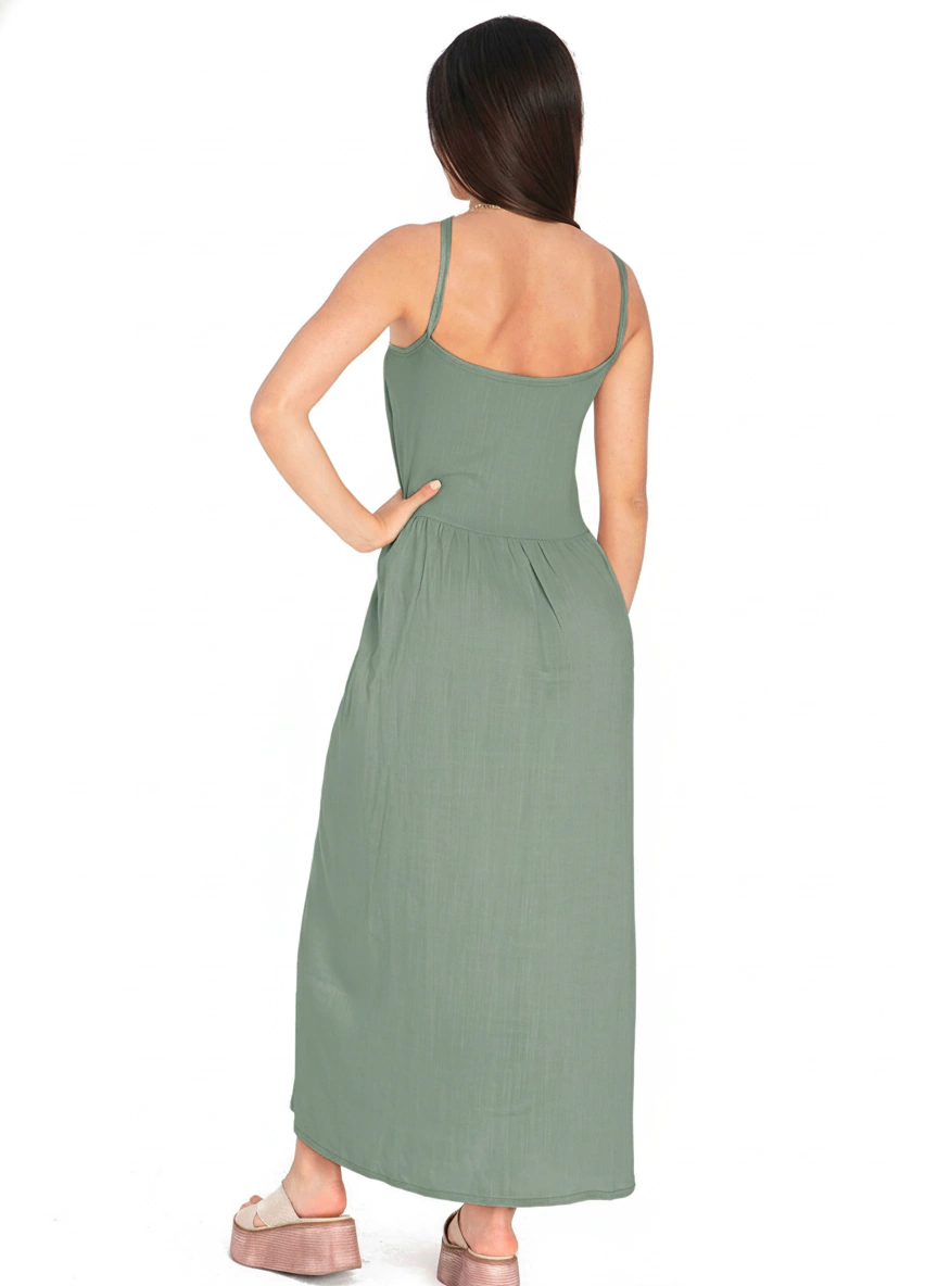 Vestido midi confeccionado en lino, con breteles finos.